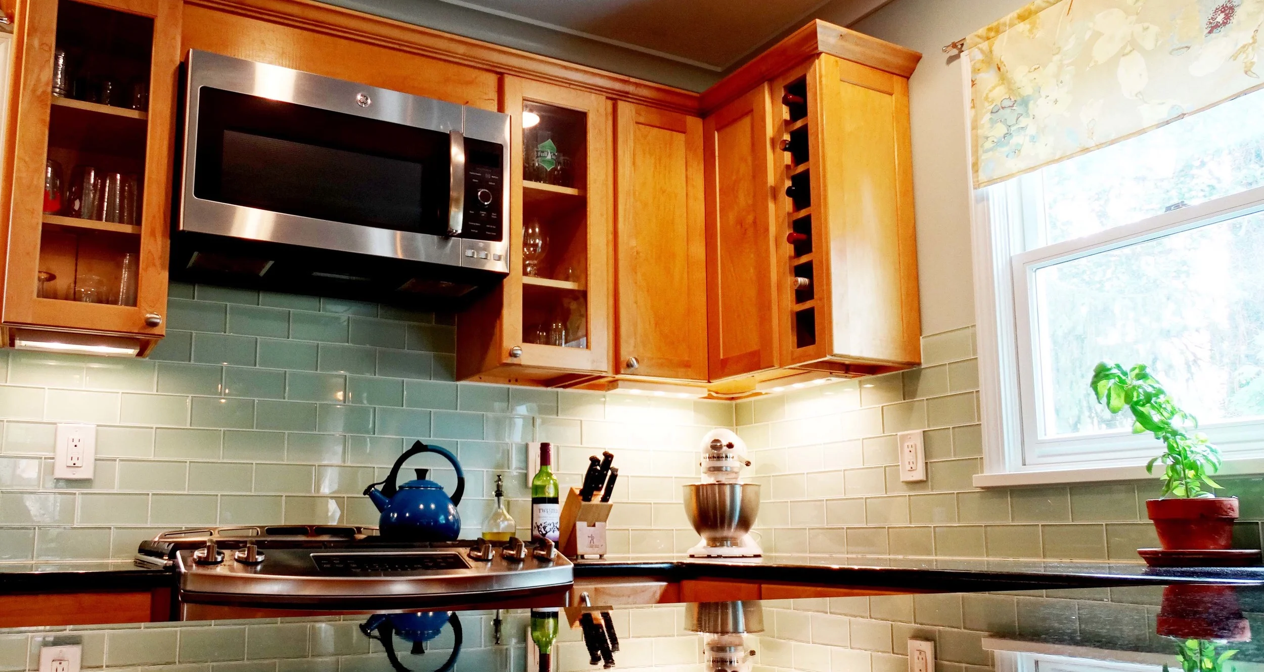 Retro glass subway tiles and under counter lighting blend modern and old school touches in this reimagined kitchen.